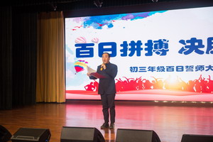 随后,年级主任段巍老师代表初三全体教师上台为同学们的中考指点迷津,鼓舞士气。老师们将在余下的100天中继续做同学们最坚强的后盾,帮助和鼓励每一位同学拼尽全力,为人生的第一个挑战做足准备,无惧冲刺,鏖战六月。全体初三任课老师对教育事业执着的追求和对学生的宽容爱护一直激励和感染着同学们。在段老师激情澎湃的演讲中,同学们的昂扬信念被激发得更加强烈。
