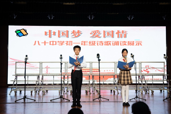 听完整场诗歌朗诵,我心潮澎湃,我们铿锵有力朗诵的,是流淌着的爱国之心,我们热情呼喊的,是虔诚的爱国信仰。一代人有一代人的责任与征程,我们要从小立志向,不忘初心与责任,在八十中怀抱的滋养与抚育下,努力学习,增长才干,怀揣着中华民族繁荣昌盛的理想大步向前……