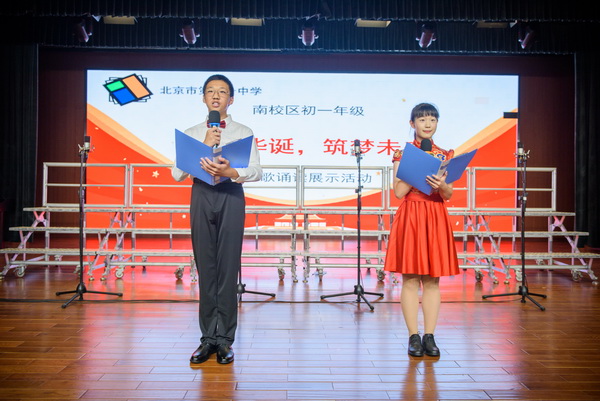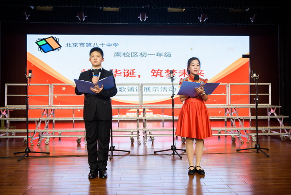 为庆祝新中国75周年华诞,弘扬民族精神,激发学生爱国热情,营造浓郁文化氛围,北京市第八十中学南校区初一年级、初二年级于2024年9月29日、30日在礼堂举办了以“礼赞华诞 筑梦未来”为主题的诗歌诵读展示活动。出席本次活动的有南校区主管校长骆玉香,教育处主任刘颖、副主任段巍,教学处主任皮艳芳、副主任沙莎,教务处主任于海霞,年级主任刘洋、裘湘菱以及全体语文教师。