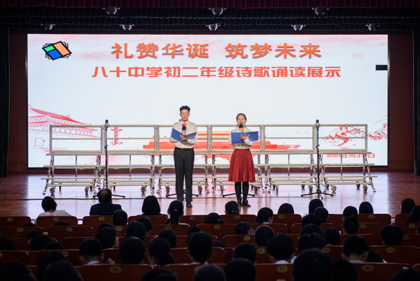 或激昂慷慨、或饱含深情,或娓娓道来……在金秋的怀抱中,我们八十学子用自己原创的诗歌诉说着对祖国的热爱和祝福。诗韵流淌,是我们对先辈们期盼山河无恙的告慰,也是我们为自己不负韶华薪火永续立下的志向。从嘉兴启航的红船,到“创造人类奇迹“的长征,再到威震四方的开国大典;从钱学森、袁隆平再到王选,在同学们的朗诵中,那些星辰大海征途中伟大的人和事,跨越时空、历久弥新,我仿佛穿越历史,和他们有了一场对话,激励我沿着前人的脚步开拓,在青春之路上绘就万千气象。这样有意义的活动,八十中还有很多。在过去一年多的学习生活中,我深刻地感受到,学校鼓励我们自己探索、自己创作。在创作诗歌搜集素材的过程中,我们阅读了大量的资料,真真切切被中华民族的伟大精神所感动着,被“红色精神”“榜样的力量”“梦想信念的力量”激励着,用“不待扬鞭自奋蹄”的内驱动力去学习、创造和奉献。