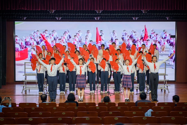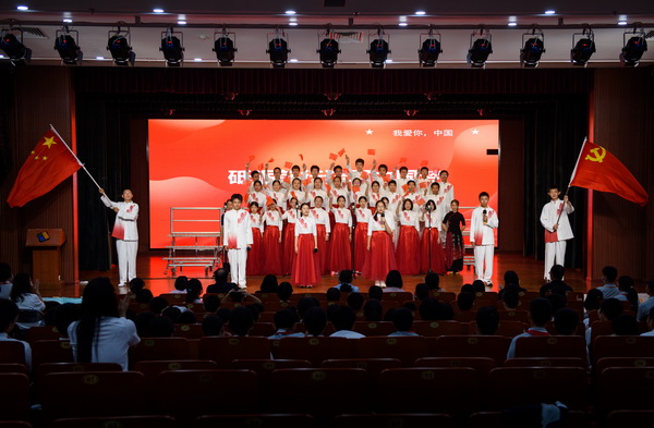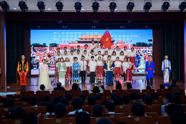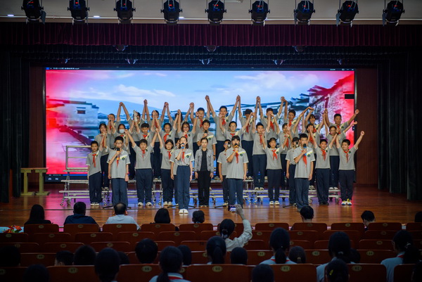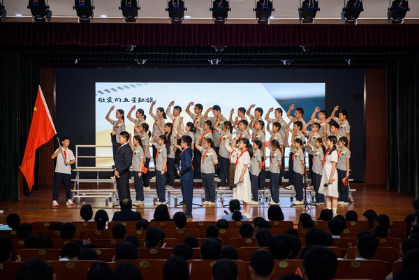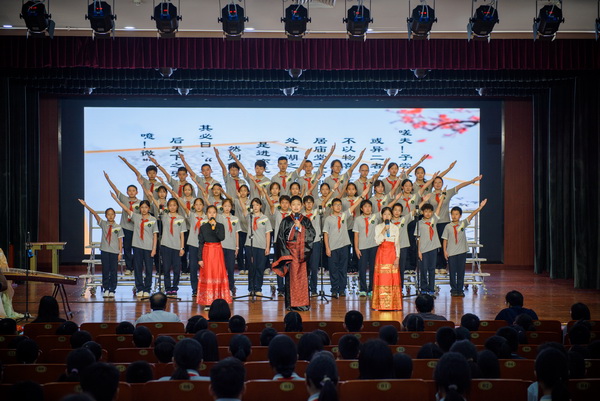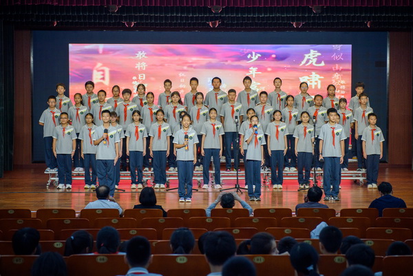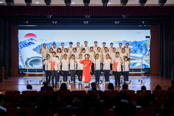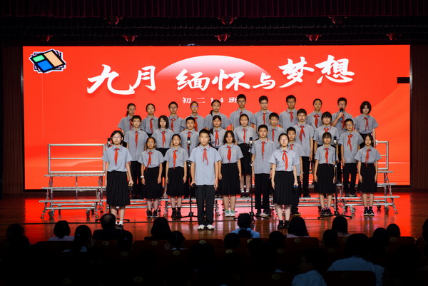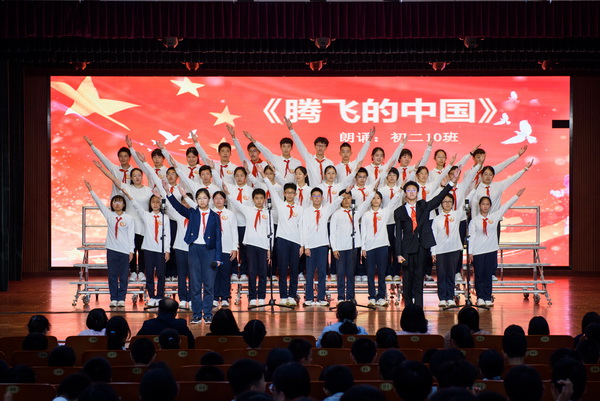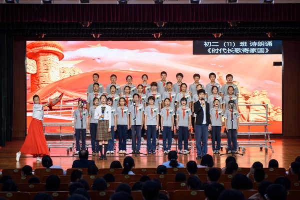 初二年级的同学们气质沉稳,步伐坚定,秩序井然之中蕴含着无限的生机与活力。他们在舞台上缓缓铺陈开一幅幅历史与现代交织的画卷,每一个细微动作,都透露出对中华文化和民族精神的敬畏与传承;每一段深情朗诵,都如同潺潺溪流,润泽着听众的心田。大家从中不仅领略到了华夏文明的博大精深与绵延不绝,更深刻感受到了时代的脉动与国家的强盛,民族自信心与自豪感在心中悄然生根。