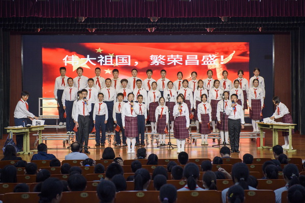 金秋九月,盛世欢腾。为欢庆中华人民共和国成立75周年,表达对祖国清澈真挚的爱,在临近国庆节这个特殊的日子里,学校举办了爱国诗歌朗诵比赛,致敬伟大中国!每一次细心彩排,都为最后的成功添上了一笔靓丽的色彩,在最终的舞台上用强大的气势打动台下的评委和观众。赤子之心,为祖国而跳动,红旗飘扬,国歌高亢。洁白的衬衣压在黑色裤子里,整齐有序的队伍昂首挺胸的踏上了舞台的台阶。“保卫黄河、保卫华北、保卫全中国!”同学们的声音十分嘹亮,时而柔美,时而刚强,时而高亢,时而低沉,时而急促,时而缓慢。经千锤百炼的磨砺,终铸就铁骨铮铮的脊梁。看今日之中国,无人敢小觑。愿以吾辈之青春,捍卫盛世之中国!就好似一团团熊熊燃烧的烈火围绕整个舞台。从苦难的古老国度到振兴中国,心潮澎湃,热泪盈眶。“家国天下,舍我其谁,有我必成!” 朗诵比赛在同学们豪迈震撼的气势与声音中慢慢落下帷幕,自豪感依然充盈内心,为我中华民族正在复兴的征途上一路高歌!