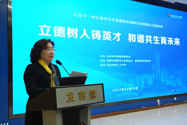 为深入贯彻党的二十届三中全会精神和全国教育大会精神,落实立德树人根本任务,推进市委教育工委大思政课建设任务,2024年11月15日,北京市第八十中学成功举办了以“立德树人铸英才 和谐共生育未来”为主题的北京市学校德育研究会基地校展示活动。出席活动的领导和嘉宾有:北京市教工委王达品副书记,北京市学校德育研究会会长关国珍、北京市教育工委宣传处于海处长,朝阳区教委副主任徐志辉、学校德育研究会的常务副会长尹丽君、副会长戴文胜、谢春风、北京市学校思政工作中心主任薛健等。