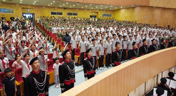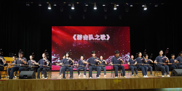 在第一篇章“新程引航,信念铸魂”中,学校有幸邀请到被中央军委授予"侦察英雄""卫国为民英雄"和"全国新长征突击手"称号的战斗英雄冷杰松将军为同学们做了题为《传承红色基因 增强国防意识》的主题报告。聆听报告,同学们深刻理解到,爱国从来不是抽象口号,而是学好知识、守护信仰的踏实行动。这一篇章在金帆民族管弦乐团精彩的二胡合奏《游击队之歌》中结束。金帆书画院的师生还向冷将军敬献了精心准备的书法作品,以表达对他的敬意。