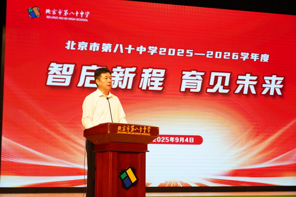 金秋送爽,启智迎新。2025年9月4日上午,北京市第八十中学以“智启新程,育见精彩——以AI为翼,赴生命之约”为主题,正式开启2025-2026学年度第一学期“开学第一课”主题教育活动。出席活动的嘉宾有北京市朝阳区人民政府党组成员、副区长张梅,中关村科技园区朝阳园管理委员会主任娄毅翔,北京市朝阳区委教育工委副书记、教委主任徐志辉,北京市朝阳区东湖街道党工委书记王庆丰,北京市朝阳区东湖派出所所长刘尧,安东油田服务集团总裁、党委书记、朝阳区人大代表范永洪,全国劳动模范、“卡脖子技术”突破者郭天光,中国人民大学高瓴学院长聘副教授宋睿华,"侦察英雄""卫国为民英雄"和"全国新长征突击手"冷杰松,北京市第八十中学校长任炜东和北京市第八十中学党委书记喻江。活动现场还有高一年级家长代表及八十中学四个校区的新生代表、睿志分校的学生代表。同时,八十中学四个校区其余全体师生也都在线上参加活动。
