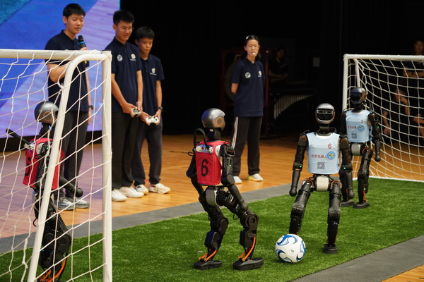 一场趣味盎然的机器人2对2足球赛和人机协同课间操展示将本篇章的气氛推向高潮。球赛中,机器人社团师生操作着四台人形机器人在“绿茵场”上激烈攻防对抗,加以生动的解说,可谓是别开生面,异彩纷呈,生动展现了机器人编程原理与团队协作的科技智慧;随后,三台人形机器人与四位学生默契配合,共同完成了第九套广播体操的展示,充满未来之感。台下嘉宾与师生纷纷为八十中科技赋能教育教学的精彩成果鼓掌喝彩。伴着全场嘉宾、师生高唱《歌唱祖国》,第二篇章圆满落幕。