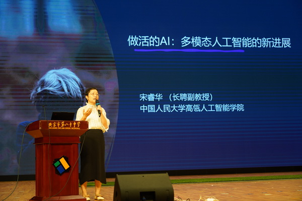 中国人民大学高瓴学院长聘副教授宋睿华带来了《AI与青少年成长》为题的报告,为同学们解读科技与成长的关联。报告中,宋教授深入浅出地介绍了多模态人工智能的技术进展,同学们在报告结束后也积极提问交流,展现了八十中学子锐意进取、接触前沿、探索未知的优秀学习品质。