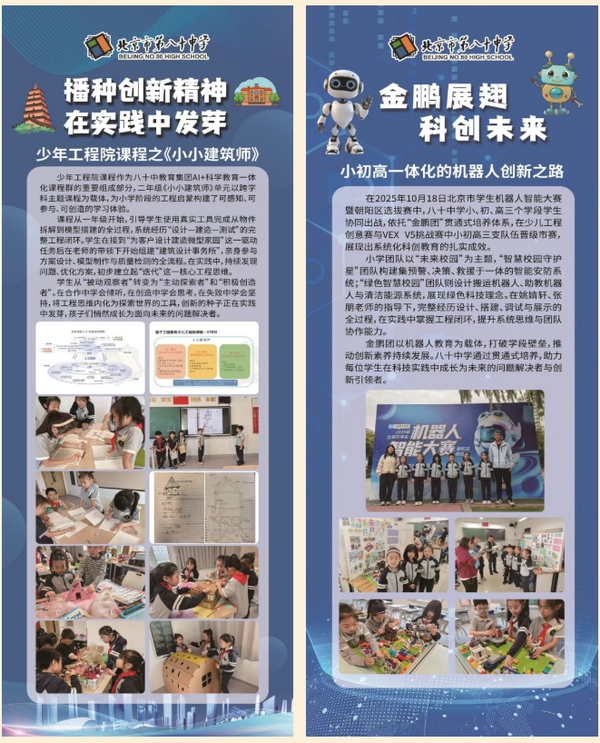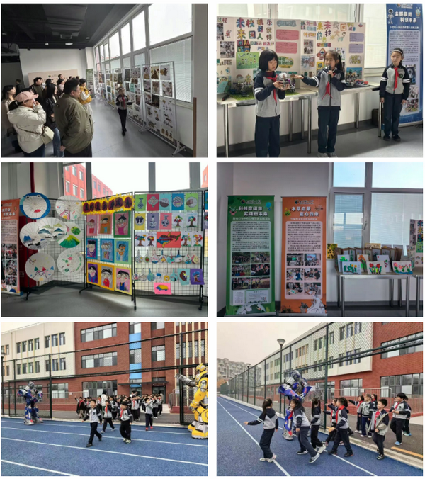 活动现场通过系列展板及静态作品集中呈现了学校在科创教育方面的多项成果:“美境行动”土壤改良项目获市级奖项,体现生态与工程思维的结合;“金蕊”自然笔记与植物栽培活动融合科学观察与艺术表达;少年工程院《小小建筑师》课程构建从拆解到建造的完整学习路径;机器人“金鹏团”在小初高一体化培养中晋级市赛;中草药文化社团则在传统智慧中融入现代创新。这些成果展现了学校在“AI+科学教育”课程群建设、跨学科融合与家校社协同育人方面的系统布局。