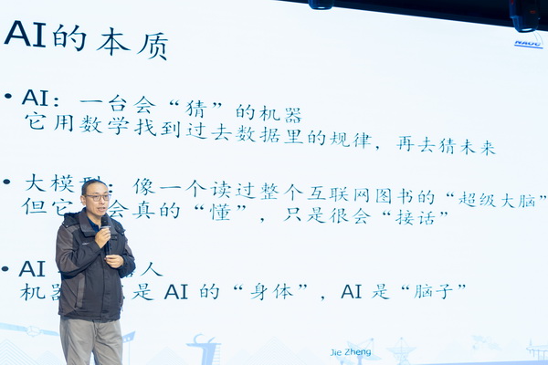 这次讲座的主题是《如何与 “超级大脑” 做朋友》。郑博士首先用通俗的语言为我们解读了 “什么是 AI”——AI通过数学算法挖掘过往数据中的规律,再基于这些规律对未来或未知情况做出预判。我们日常接触的 DeepSeek、豆包、ChatGPT 等,本质上都是“大模型”技术的AI应用。。