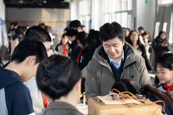上午8时,张振军院士走进东校区“小小建筑师”课堂。面对一张张稚嫩却专注的面孔,院士化身为亲切的项目顾问,与孩子们一同探讨建筑的稳固性,体验从客户需求到设计迭代的全过程。随后,在“少年工程师”课堂上,看到初中生们运用多学科知识自主设计、组装并成功骑行载人小车,张院士露出了赞许的目光。