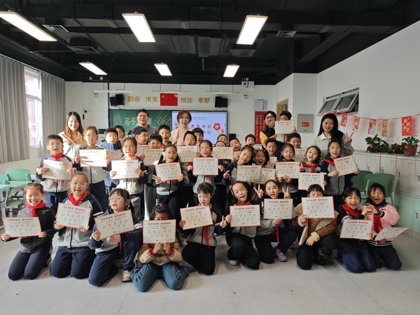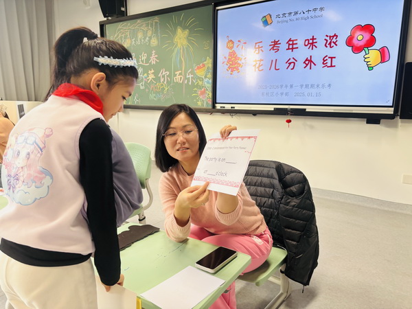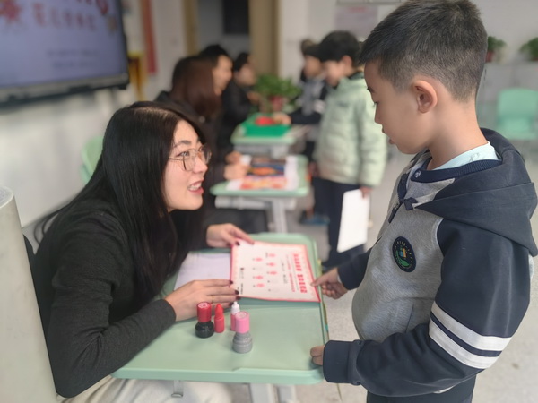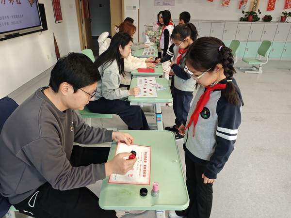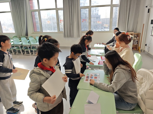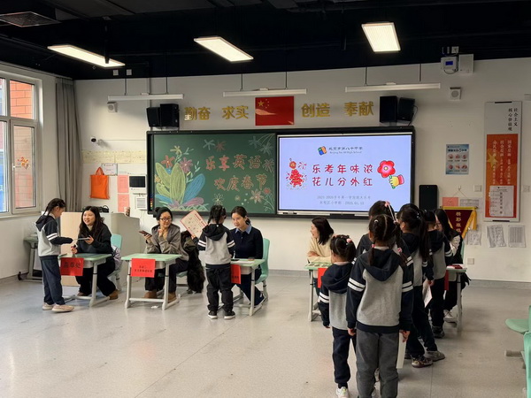 英语学科以“乐享英语·欢度春节”为主题,共安排了3项活动:在“我给家人来拜年”活动,学生抽取家人卡片,用句型 "Happy Chinese New Year......!"向抽到的家庭成员拜年,将英语知识与过年习俗相融合;在“新年盲盒我来拆” 活动,学生通过句型 It's my......来描述自己在盲盒里抽到的文具,在真实情境中运用了重点单词和句型;在“英文歌曲送祝福” 活动中,学生任选一首这个学期学过的英文歌曲进行演唱,在歌声中巩固了核心语言。一年级英语乐评通过卡片、歌曲等多元载体,激发学生兴趣,兼顾趣味性与实践性,提升了学生英语口语表达能力与学习自信心。