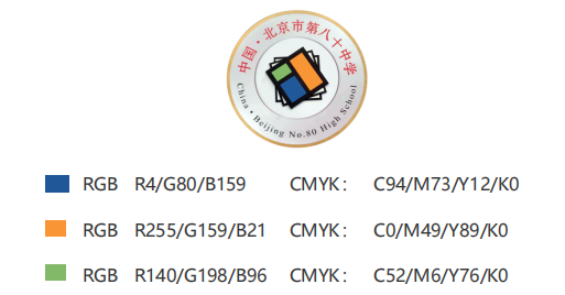 学校校徽其主体为由数字“80”构成的正方形,其形似一本本打开的书、一扇扇窗,寓意“用知识开启心灵之窗”,主体形状及其后方以不同角度层叠的正方形象征着书页,并为校徽整体增添动感和活力。校徽选用橙、绿、蓝作为主颜色,代表八十中学生的青春活力与热情。橙色代表大地,象征着孕育培养人才;绿色代表生命,象征着青春活力;蓝色代表天空,象征着未来和希望。