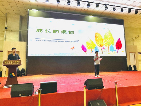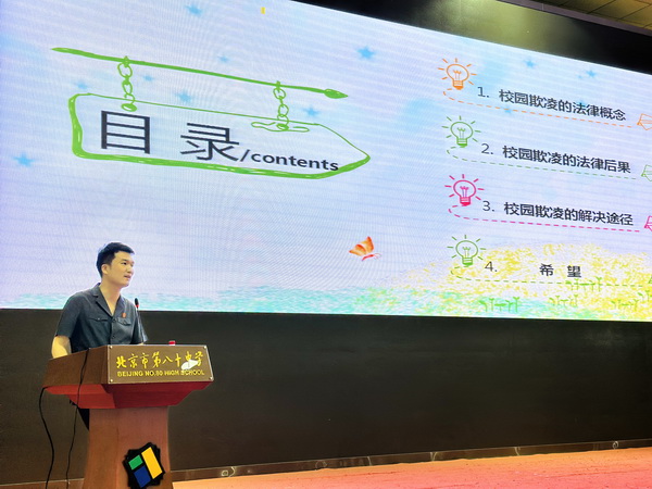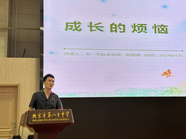为了营造文明、和谐、平安的校园环境,提高同学们的法律素质和自我保护意识,2024年5月21日上午,八十中学北校区特别邀请北京市第一中级人民法院未成年人案件综合审判庭赵旭涛法官开展了以“成长的烦恼”为主题的防范校园欺凌普法宣传讲座活动。赵旭涛法官一直从事与未成年人相关的刑事、民事和行政案件的审理工作。年级主任管俊老师带领北校区初一年级全体师生共同参加了本次活动。