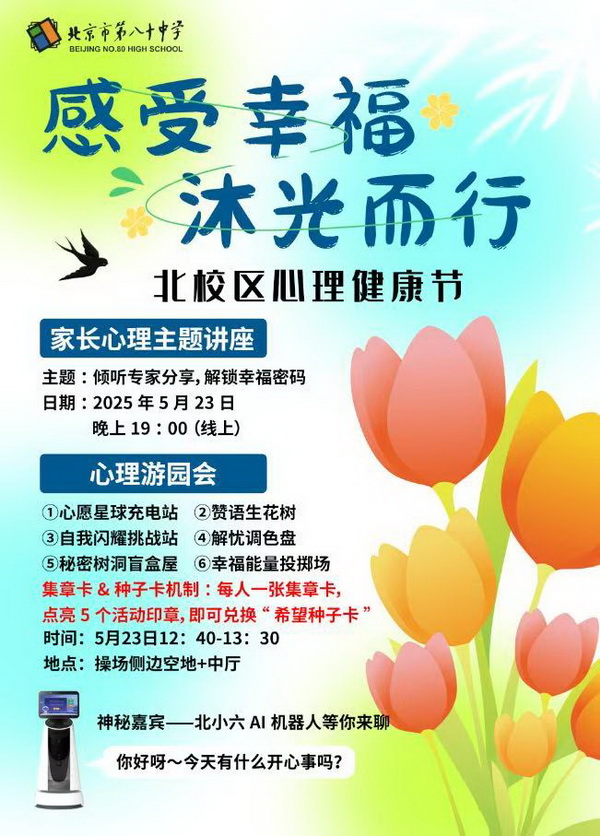 四月的雨水浇灌新芽,五月的阳光孕育希望。为守护师生心理健康,北京市第八十中学北校区于五月精心策划“感受幸福,沐光而行”心理月主题活动。通过多种形式的心理健康教育,构筑心灵桥梁,成就阳光学子。