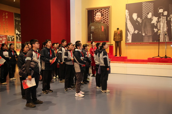 最震撼的瞬间,定格在“开国大典”展区。巨幅油画《开国大典》前,毛主席立于天安门城楼的身姿栩栩如生,微微前倾的姿态里,似要向世界宣告那句振聋发聩的“中国人民从此站起来了”。阳光透过展厅高窗,为画作镀上一层金黄光晕,神圣而庄严。我们不约而同列队肃立,目光凝注这载入史册的一刻。