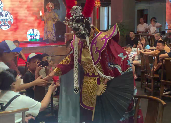 返回成都市区后我们欣赏了茶艺表演、戏曲舞蹈、川剧变脸。流水从半米长的壶嘴中精准地落入茶杯,轻盈的白色水袖在空中舞动,演员从嘴中瞬间喷出火焰,伴随着音乐不断变换脸谱,同学们被精妙的文艺表演深深吸引,为呈现精彩表演的演员送上欢呼和掌声。