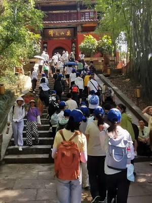 下午,我们来到了象征蜀地文明的又一著名文化遗产——乐山大佛。乐山大佛又名凌云大佛,是世界最大的摩崖石刻弥勒坐像,位于三江交汇之处。我们拾级而上,遥望江景,在看到乐山大佛时由衷地赞叹,实谓巧夺天工!