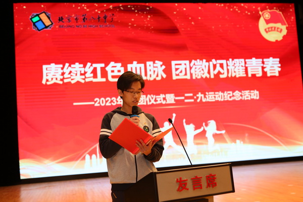 高三9班郭怀之同学作为2022年朝阳区五四红旗团支部的代表进行发言。郭怀之同学提到:“我们的祖国正处于一个伟大的时代,一个充满机遇和挑战的时代,一个需要我们奋发有为的时代。”广大团员需要从时代出发,抓住机遇,继承和发扬“一二·九”运动的优良传统,以青春之我,创造青春之中国,以青春之中国,引领青春之世界。