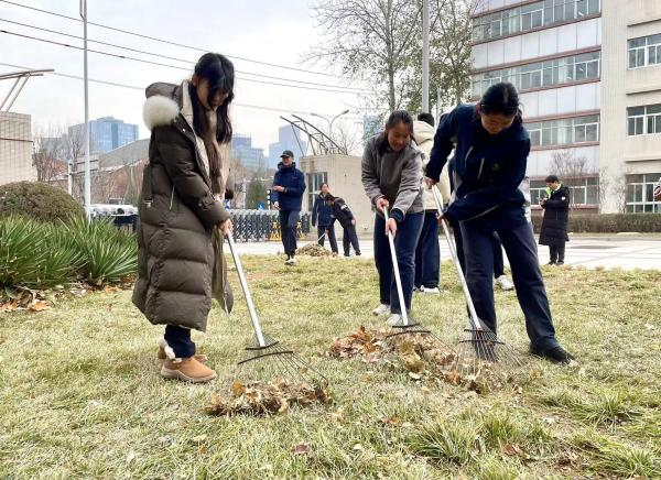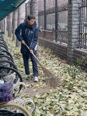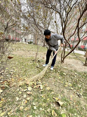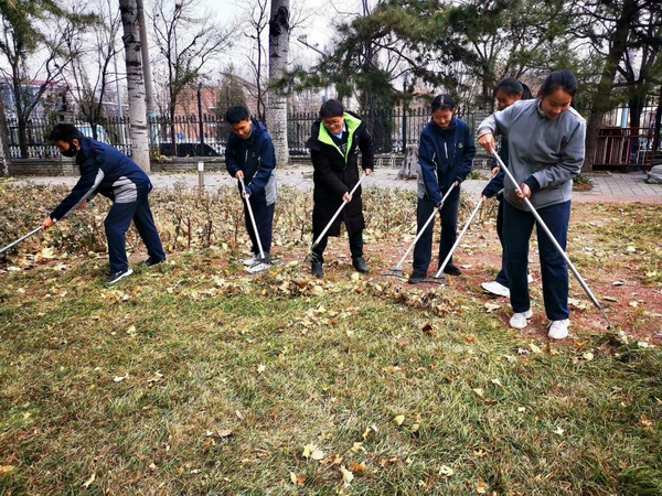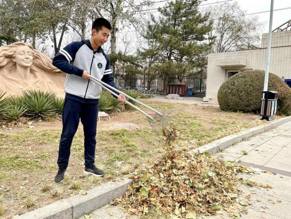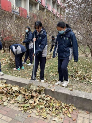 2023年12月4日,在综合实践教研组组长何斌老师、教育处刘颖男主任、总务处栾天才主任的精心策划下,高一5班、8班、9班主动报名,在望京校区校园中开展落叶清理劳动。
