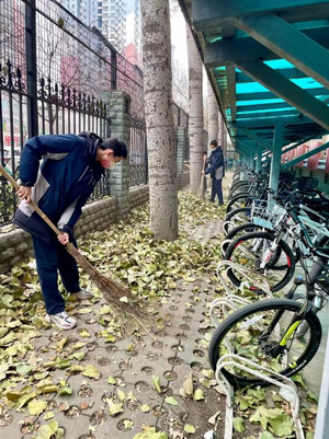 高一9班学生在班主任张苗苗老师的带领下,到学校南门自行车棚中清理落叶。南门自行车棚是同学们集中摆放自行车的场所,由于位置比较狭窄,所以落叶较难清理。同学们用大笤帚分批清理出了大量入秋以来积存的落叶。清理后的自行车棚更加干净整洁。
