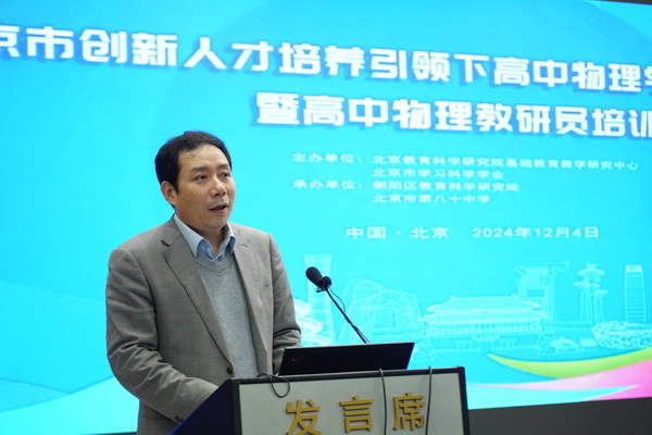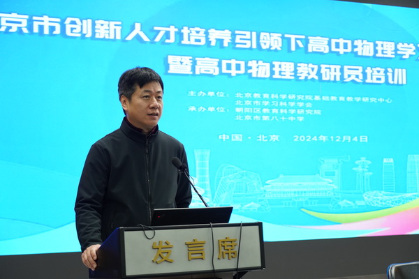 2024年12月4日,由北京教科院基础教育教学研究中心和北京市学习科学学会科学教育专委会主办,北京市朝阳区教育科学研究院和北京市第八十中学承办的“北京市创新人才培养引领下高中物理学习测评研讨会”在北京市第八十中学望京校区举行。北京开放大学党委书记方中雄教授,北京市朝阳区教育科学研究院院长李怀东,首都师范大学物理系郑鹉教授,北京市第八十中学校长任炜东参加了开幕式。北京教科院基础教育教学研究中心物理教研员张玉峰博士主持开幕式,北京市各区全体高中物理教研员和部分示范性学校教研组长等160多人参加了研讨会。