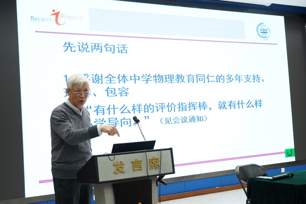 首都师范大学物理系郑鹉教授做了题为《北京市高考物理命题实践思考》的报告。郑教授首先回顾了物理学科的总体特征以及高中物理学科特征,同时围绕着“高考考什么”和“高考怎么考”两大命题,结合物理特征进行了命题立意剖析。郑教授强调了回归物理教材,回归物理课堂,回归物理学科本质的命题主张,重申了高考命题要侧重试题立意和能力考查的要求。