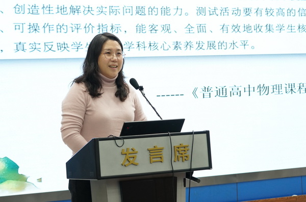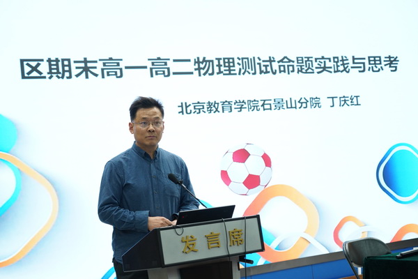 北京教育学院石景山分院物理教研员丁庆红老师,做了题为《区期末高一高二物理测试命题实践与思考》的报告。丁老师从考试评价的持续性立意入手,提出“评价是为了使一个人变得更美好”的观点。在命题过程中要遵循课程标准理念,命题素材要基于学生学情和发展,培育学生的学习能力。要引导学生回归课本,设计题目情境的最佳呈现方式。要通过命题树立学生的科学态度和责任,从做题到做事到做人。