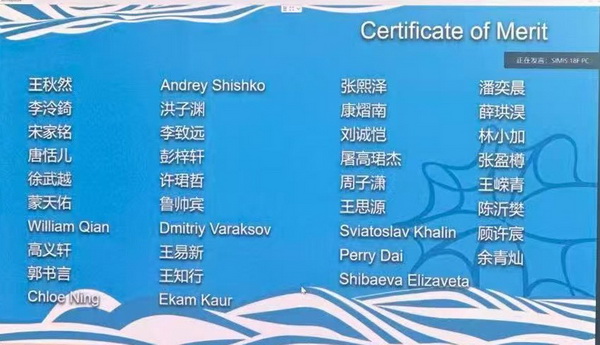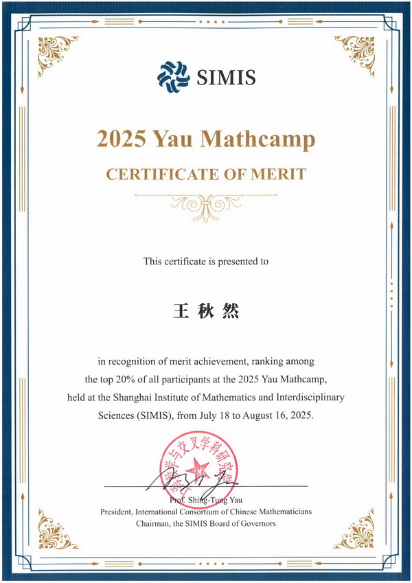 载誉归来,王秋然同学坦言:“感谢学校给予我参加本次夏令营的宝贵机会,和国内外166位优秀同学探索数学奥秘,欣赏数学之美。非常幸运,最终我们拿到了仅有5个名额的最佳项目金奖。站在领奖台的那一刻,我觉得那满是墨迹的草稿纸远比证书更闪耀。这次经历带给我的不仅是知识上的收获,更重要的是让我体会到数学的浪漫不仅在于探究学习的魅力,更在于与同道者的共同奋斗和互帮互助。在今后的学习生活中,我会带着这些收获继续努力!”