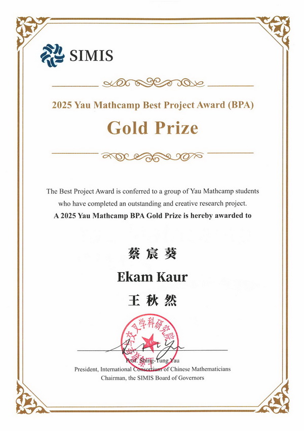 8月16日上午,2025年丘成桐中学生数学夏令营(Yau Mathcamp)圆满落幕。来自北京市第八十中学2024级初二24班的王秋然同学凭借卓越表现,在167名优秀中学生中脱颖而出,获夏令营前20%优秀营员称号,其所在团队入围18个团队的决选,最终斩获最佳项目金奖(该项目设5个金奖,6个银奖,7个铜奖)。