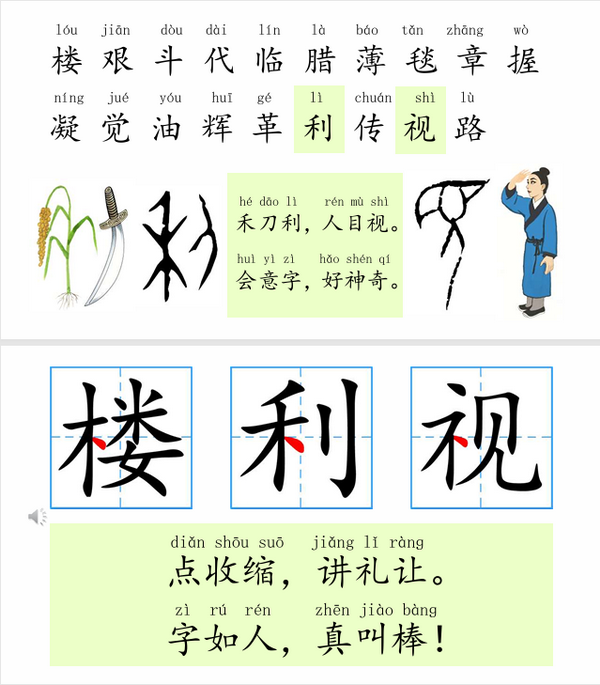 课堂上,孟老师通过五大特色活动层层递进,将语文要素与革命文化巧妙融合:一是从学生熟悉的数学图形切入,对比天坛圜丘、奥体公园水立方与八角楼的建筑特色,自然引出课题,激发探究兴趣;二是采用接读形式,精准指导“夜幕降临”“寒冬腊月”等重点词及“薄毯子”“察觉”等多音字,帮助学生把握文本情感;三是设计看图猜字情境,认识甲骨文“利”“视”等会意字,写字指导聚焦“利”“视”“楼”三字,强调“点收缩、讲礼让”的书写要点,夯实语文基础;四是依托图文对照聚焦动词用法,提升学生语言运用能力;五是通过句子组串解读“星星之火可以燎原”的内涵,结合《朱德的扁担》《长征》《开国大典》等经典图文拓展认知,并回扣《吃水不忘挖井人》形成教学闭环,让红色基因悄悄浸润学生心灵。