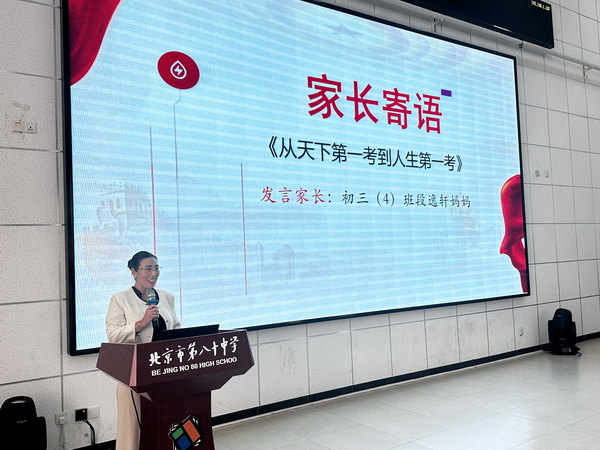 大会伊始,主持人以热情洋溢的开场辞拉开序幕。随后,初三4班段逸轩同学的家长作为家长代表登台发言。身为律师的她,结合自身参加“天下第一考”——律师资格考试的亲身经历,将其与同学们即将面临的“人生第一考”——中考相联结,从备考心态的调整到学习方法的优化,倾囊相授、深入分享,让在场学子受益匪浅。