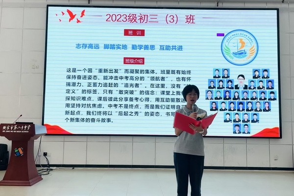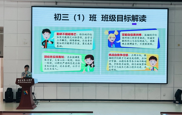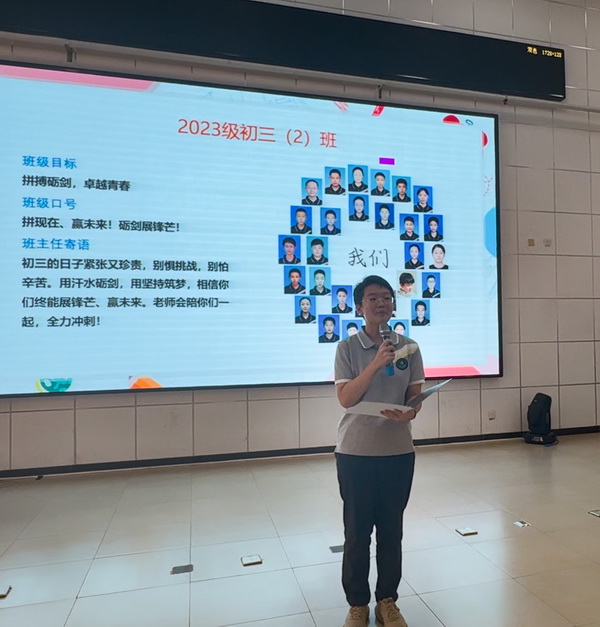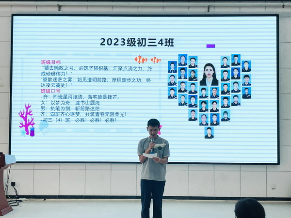 而后,四个班的班长依次上台。他们先向全体师生展示了全班同学与老师的合影,定格下团结友爱的瞬间;随后详细介绍了本班的班级目标与目标解读,字字铿锵、句句激昂,尽显各班学子的精神风貌与雄心壮志。紧接着,班主任们纷纷送上寄语,字里行间满是殷切期望与美好祝愿。随后,全体同学昂首挺胸、目光坚定,以饱满的精神状态齐声喊出班级口号,那整齐划一的呐喊气势如虹、振奋人心,恰似“少年自有少年狂,谁说年少不轻扬”,将大会气氛推向高潮,充分展现出初三学子昂扬的斗志与必胜的信念。