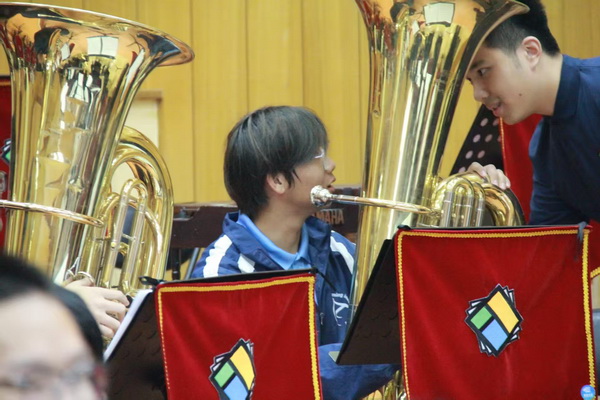 中美学生交流活动在艺术楼205排练厅拉开帷幕,现场气氛热烈温馨。活动伊始,金帆管乐团以“Welcome to our school Jin Fan Wind Orchestra”的热情问候欢迎远道而来的美国友人。随后,乐团奏响舒缓温暖的《我和我的祖国》,展现出团员扎实的演奏技艺与自信风采。在接下来的互动环节中,金帆团员邀请美国朋友试奏大号,双方共同演绎了《钢铁洪流进行曲》的雄浑乐章。清脆的掌声与欢快的笑语交织,如跃动的节拍,使整个排练厅洋溢着温暖与喜悦的气氛。