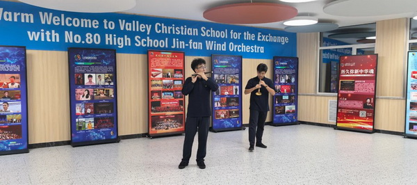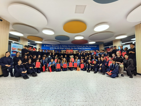 2025 年 10 月 10 日下午,美国圣何塞山谷克里斯汀学校行进管乐团师生一行访问北京市第八十中学,与金帆管乐团、金帆书画院师生开展友好交流。八十中学党委书记喻江、副校长廖克伟参与接待。