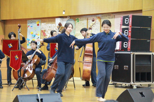欣赏完中国传统乐器竹笛和唢呐的独特妙处后,美国友人踏着弦乐室内乐团明快热烈的《罗马尼亚舞曲》的节奏步入会场。接着,一曲《良宵》以婉转旋律将观众带入宁静夜色,领略东方音乐的含蓄之美;而激昂的《红星歌》则向美国朋友展现了中国红色精神历久弥新的时代活力。聆听过程中,美国朋友们随着节奏轻轻击掌,脸上始终洋溢着会心的微笑。随后,伴着《溜冰圆舞曲》与《第二圆舞曲》的优美旋律,金帆舞蹈团员翩然起舞,为在场师生带来一场视听盛宴。