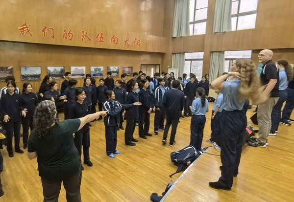 音乐无国界,舞蹈亦能沟通心灵。演奏环节结束后,金帆团员与美国友人手拉手围成圆圈共舞,欢声笑语不绝于耳。美方师生还现场教学了一套富有特色的美式身体活动操,将现场气氛推向高潮。