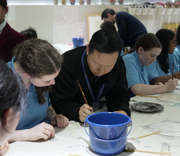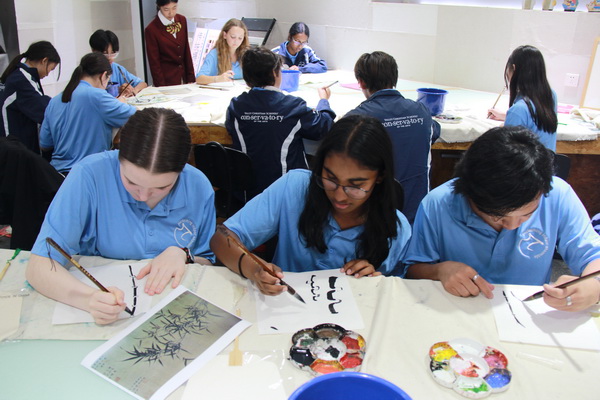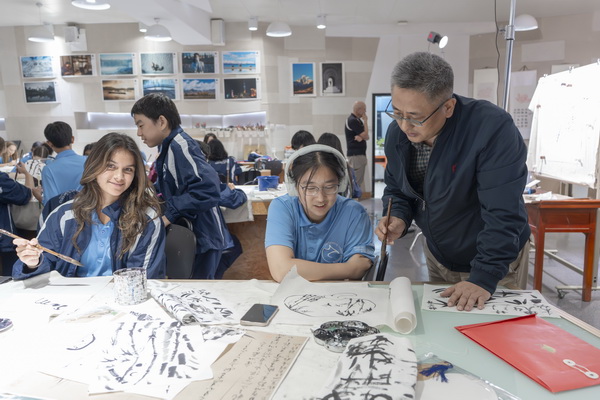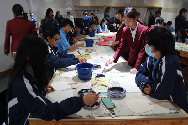 在激动人心的音乐、舞蹈交流之后,美国师生一同走进金帆书画院艺术工作室,感受中国传统艺术之美。学校特邀人民网书画研究院副院长赫英海老师亲临现场,为师生教授国画技艺。