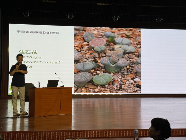 达尔文理论认为,植物在自然界激烈的竞争中优胜劣汰,形成了独特的生存智慧。杨老师围绕这一核心,从植物开花、根茎叶及果实和种子三个方面展开了精彩分享。在植物开花智慧的部分,杨老师展示了菠萝蜜老茎生花的奇特现象。菠萝蜜原生在热带雨林,植物郁闭度高,只有顶层灌木能接触充足光线。菠萝蜜进化出老茎生花,既能最大限度利用空间,又便于传粉和动物取食传播,还能缩短营养输送距离,利于果实生长。还有那高海拔的绿绒蒿属植物,在紫外线强、昆虫稀少的环境下,开出大而鲜艳的蓝紫色花朵,既反射紫外线保护自己,又能吸引昆虫传粉。而塔黄更是神奇,它能自建“温室”,黄色苞片抵挡紫外线,为传粉昆虫提供庇护,还散发特殊气味吸引昆虫,帮助完成花粉传播。