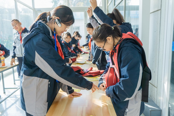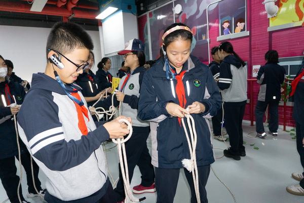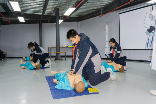 在“教室火灾逃生”环节,同学们先系统学习了火灾应对常识,随后沉浸式体验火灾场景。大家深刻认识到,教室突发火灾时,切勿贸然跳楼,需保持冷静、有序撤离,优先寻找安全出口,不携带无关物品,以“快、静、齐”的标准迅速在指定安全区域集合,切实掌握了科学逃生技巧。“地震小屋”体验则让同学们收获颇丰。大家不仅学习了地震中的安全撤离方法,更身临其境地感受了三级至七级地震的不同强度,直观体会到地震带来的灾害危害,进一步夯实了地震逃生的实用技能,这些震撼的体验给同学们留下了深刻印象。此外,同学们在老师的带领下学习了系绳结、人工呼吸、海姆立克急救法,在实践中掌握了很多急救知识。