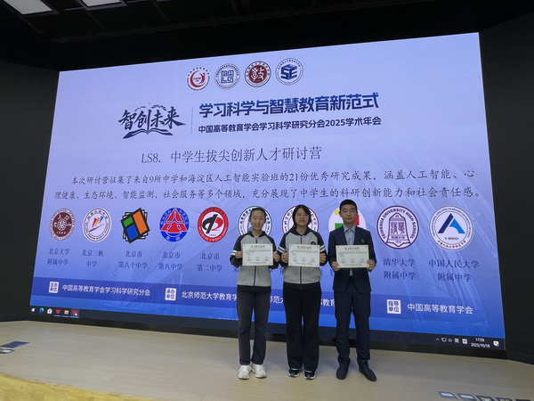 2025年10月19日,北京师范大学教育学部承办的“中国高等教育学会学习科学研究分会2025学术年会-中学生拔尖创新人才研讨营”成功举办。中学生拔尖创新人才研讨营为年会新设项目,邀请了来自9所中学和海淀区人工智能实验班的21份优秀研究成果,涵盖人工智能、心理建设、生态环境、智能监测、社会服务等多个领域,充分展现了中学生的科研创新能力和社会责任感。我校南校区科技主管陈宇红老师带领高中部李馨雨、唐巍桓、初中部姚垚三位同学参加了本次研讨营活动。