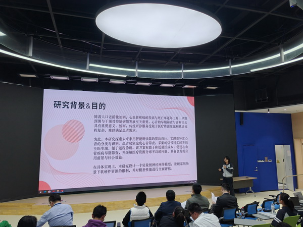 我校李馨雨同学分享了《基于神经网络的心音智能分类算法研究》的科研项目。她设计的轻量级神经网络模型,可以让心血管疾病患者居家采集心音信号并实时上传到医生端,后台用算法设计实现正异常心音的分类与识别,实现了低成本的远程诊断。孙建文教授对于李馨雨的动手能力给予了高度认可,并就项目后续的迭代问题进行了深入的交流。