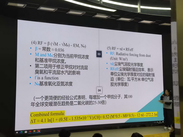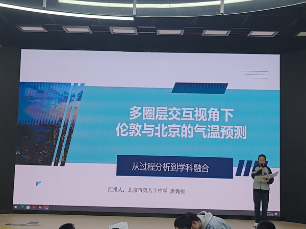 我校唐巍桓同学带来了《多圈层交互视角下伦敦与北京的气温预测》的研究报告。她将伦敦与北京两地气温的关键影响因素用数学、物理、化学、生物学知识建立了函数关系,并制作了生动的动画演示。三位教授充分肯定了唐巍恒同学跨学科融合的创新研究方法,并表达了对她“ 做未来气候的塑造者,为人类命运共同体而努力”世界观的一致赞赏。