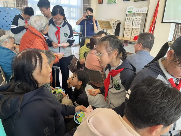 节目表演结束后,同学们将亲手制作的重阳节手工作品送到老人手中,小小的礼物承载着对长辈的真挚关爱。在温馨的氛围中,同学们与老人互签 “连心卡”,卡片上稚嫩的字迹与沧桑的笔触相映成趣,定格下两代人心灵相通的美好瞬间。活动最后,老少携手合唱《萱草花》,全体参会人员合影留念,将这份温暖与感动永久珍藏。