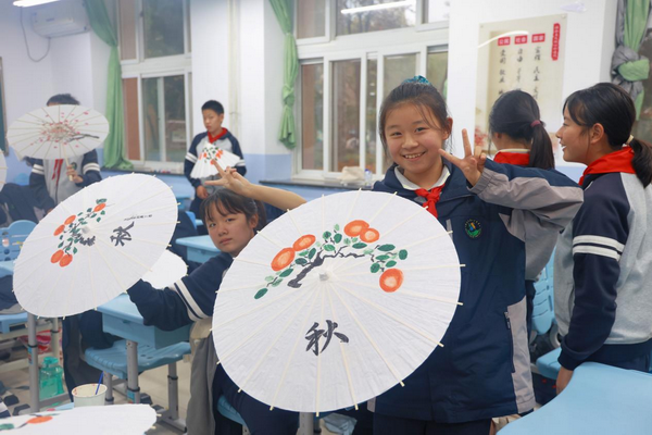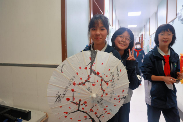 油纸伞课堂上,诗意在笔尖流转。梅枝横斜出傲骨,兰叶舒展带幽香,竹影亭亭立气节,菊瓣层层藏清雅。同学们蘸取颜料,在素白伞面上细细晕染,一朵朵“四君子”便鲜活起来。亲手撑开的不仅是一把油纸伞,更是一幅可携可赏的流动中国画卷。