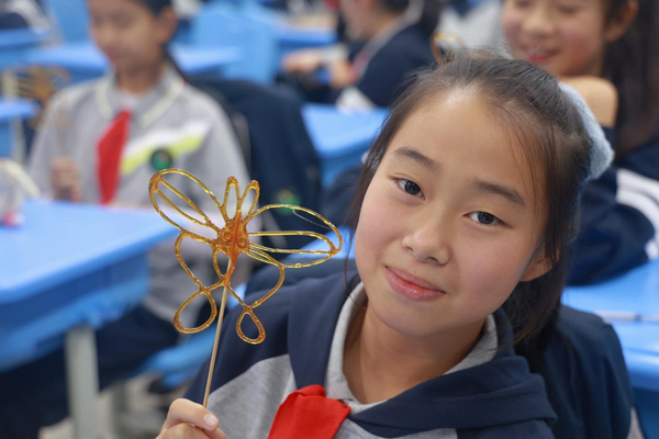 吹糖人老师更是妙手生花。温热的糖稀在掌心揉、拉、捏、转,瞬间化作圆润的糖坯。对准管口屏息凝神轻轻一吹,糖稀便顺着气息慢慢膨胀、塑形——有的鼓成胖乎乎的小猪,圆滚滚的肚皮透着琥珀色的光;有的化作灵动的小鸟,翅膀舒展似要振翅起飞。这场味觉与视觉的双重盛宴,让校园里的欢笑声盖过了淅沥雨声。