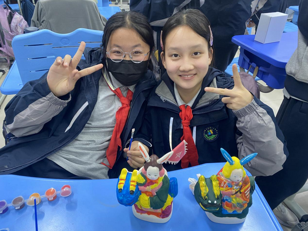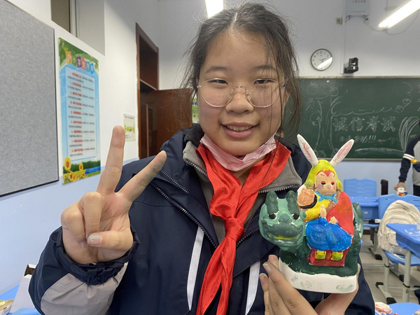 老北京兔儿爷的创作环节中,同学们创意十足。女生们偏爱给兔儿爷画上粉嫩腮红、披起鲜红战甲,男生则喜欢用浓墨勾出威武眉眼。每一件兔儿爷都独具特色,既保留着老北京民俗的传统韵味,又融入了少年人的奇思妙想。捧在手中沉甸甸的,不仅是彩塑的质感,更是对传统民俗的喜爱与认同。