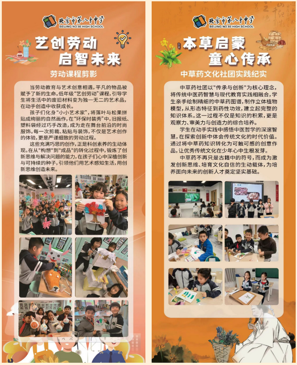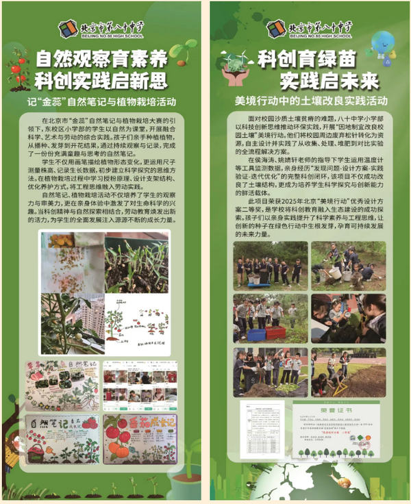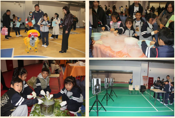 活动现场通过系列展板及静态作品集中呈现了学校在科创教育方面的多项成果:“美境行动”土壤改良项目获市级奖项,体现生态与工程思维的结合;“金蕊”自然笔记与植物栽培活动融合科学观察与艺术表达;少年工程院《小小建筑师》课程构建从拆解到建造的完整学习路径;机器人“金鹏团”在小初高一体化培养中晋级市赛;中草药文化社团则在传统智慧中融入现代创新。这些成果展现了学校在“AI+科学教育”课程群建设、跨学科融合与家校社协同育人方面的系统布局。
