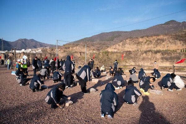 最后一天,我们前往红旗渠。在实训基地,同学们通过简易工具模拟修渠工序,亲身体验当年建设者面临的艰辛。徒步行走于青年洞的蜿蜒渠岸,触摸冰凉坚硬的石壁,“劈开太行山,漳河穿山来”的豪迈从课本走入现实。在红旗渠纪念馆,斑驳的工具与泛黄的照片,无声讲述着那段“自力更生、团结协作”的岁月。