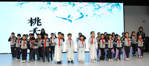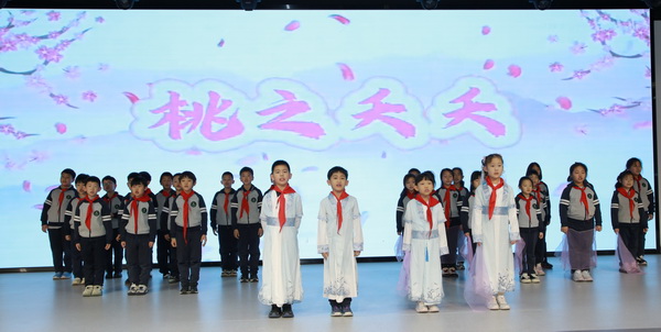 二年级2班带来了明快的欢歌《桃夭》。小演员们搭配灵动的手势动作,用甜美的嗓音吟诵“桃之夭夭,灼灼其华”,将桃花盛开的烂漫图景与新生的美好喜悦传递给每一位观众,现场氛围愈发热烈。