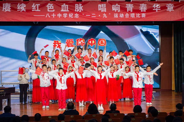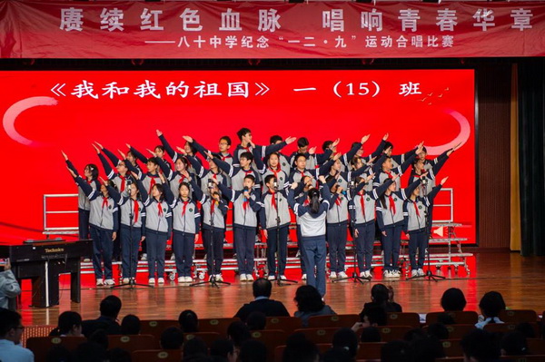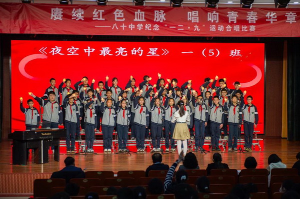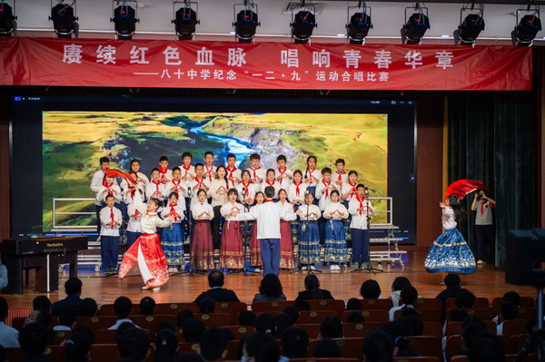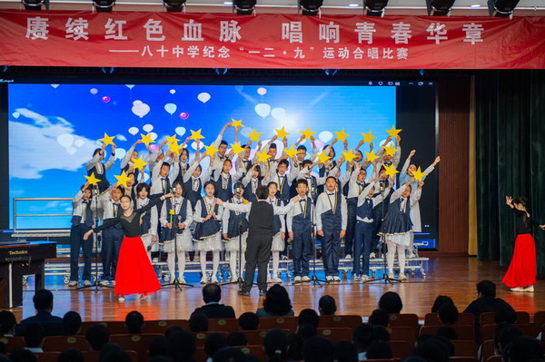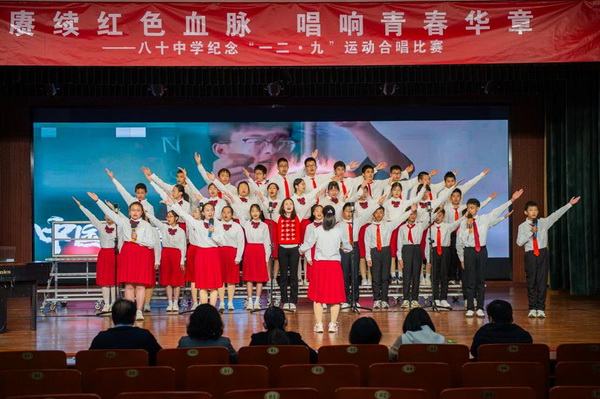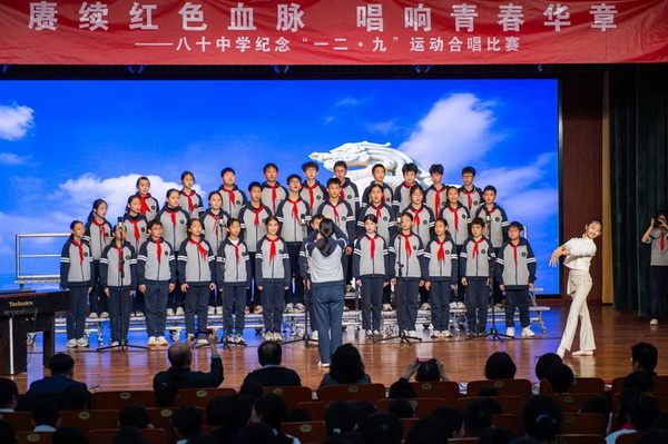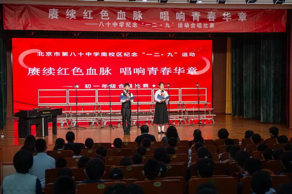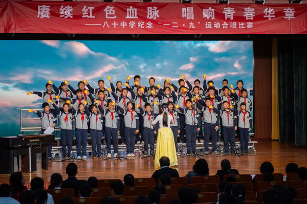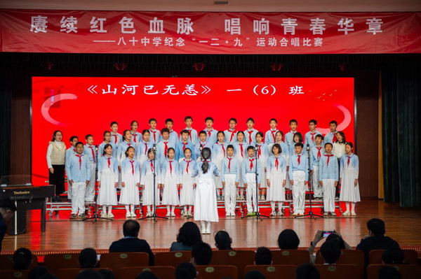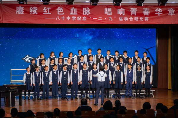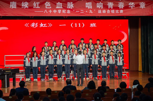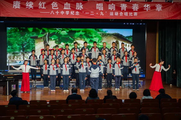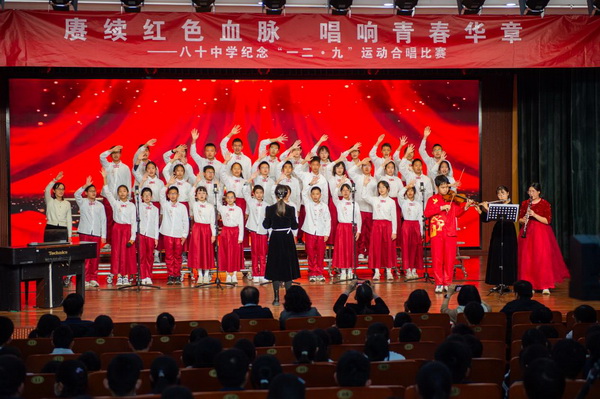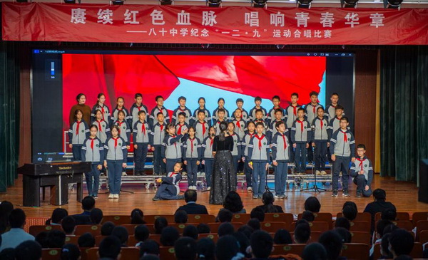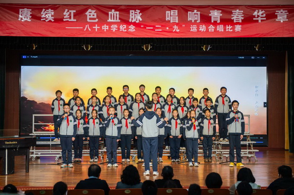 “华北之大,已经安放不得一张平静的书桌了!”1935年“一二·九”运动,这句满含血泪的话从无数青年口中喊出。今年是“一二·九”运动90周年,为纪念这个具有特殊意义的日子,2025年12月23日,北京市第八十中学南校区教育处、艺术组、年级组联合举办初一年级纪念“一二·九”运动合唱比赛。激昂旋律响彻校园,师生以歌声回望峥嵘岁月,唱响新时代少年的家国情怀。